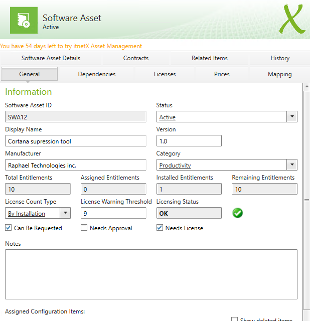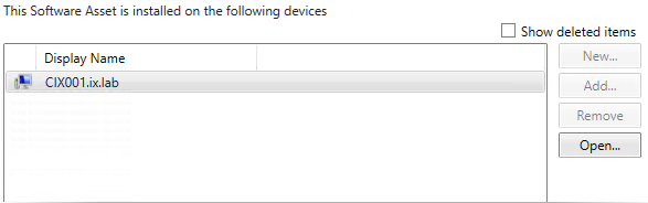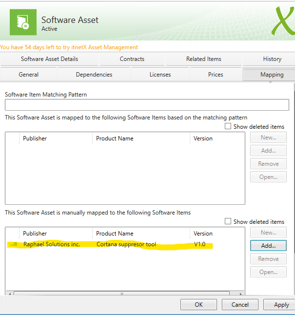 Go back and open the Software Asset once more and switch to the Mapping tab. On the Mapping tab, add the Software Item created at the beginning in the panel labelled with This Software Asset is manually mapped to the following Software items: