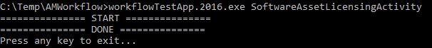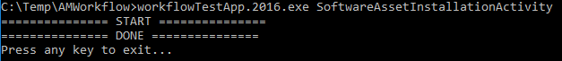 Copy the itnetX.AssetManagement.Workflows.dll and the workflowTestApp.2016.exe from the installation package to a new folder on your Management Server, then open a Command-Window in this Folder and run the "Software Asset Installation Workflow"